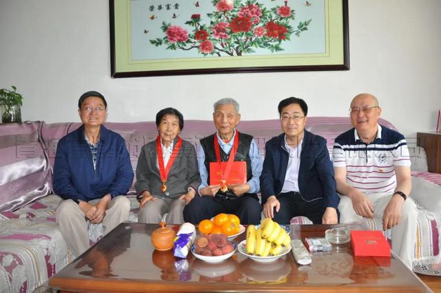 今年88歲的老黨員崔丙辛,身患眼疾幾十年,行動不便,但一直保持樂觀向上的心態(tài),他和老伴相互依靠,老伴是他的眼睛,他是老伴的精神寄托。崔丙辛老人晚年愛好詩文,他就口說,老伴或孩子代他寫在紙上,就這樣寫了不少贊美生活的詩歌作品。師健副廳長一行來到他的家中慰問,代表省住建廳黨組織為他佩戴“光榮在黨50年紀念章”,并送上慰問金。崔丙辛老人激動地和師健副廳長及公司領導聊談他現在的幸福生活,并拿出剛剛寫好的詩文給領導們看。領導們被他執(zhí)著、堅韌的黨員品格深深感染,同時關切地詢問他的身體健康、生活起居等情況,鼓勵他保持良好心情,祝他生活一天比一天好。榮幸的是崔丙的老伴也獲得“光榮在黨50年”紀念章,領導們高興地和老兩口一起合影留念。