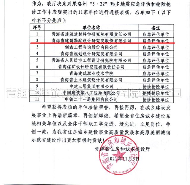 近日,青海省住建廳下發(fā)青建設(shè)[2021] 317號(hào)文件,對(duì)在果洛州“5. 22”瑪多地震抗震救災(zāi)工作中表現(xiàn)突出的11家單位和企業(yè)進(jìn)行表揚(yáng)通報(bào),我公司在表揚(yáng)通報(bào)之列。