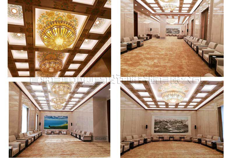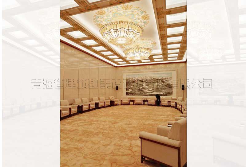 人民大會堂青海廳根據(jù)全國人民大會堂管理局安排重新調整位置,需要重新裝修改造。新青海廳位于人民大會堂Ⅱ段三層東南角,北側與人民大會堂金色大廳和三層小禮堂相對,南側面向人大辦公樓內院。位置與金色大廳和小禮堂位置靠近,原功能為領導人休息廳。青海廳總建筑面積350平方米,會議廳平面尺寸為29.3米×8.0米狹長的空間,建筑內表面積為222.68平方米,廳內原設計設變形縫,中間約2/5處設框架柱,吊頂高度5.0米左右,周邊設有服務間、衛(wèi)生間、配電間等服務設施。原裝修為2000年裝修改造工程。廳室尺寸為一狹長空間,長寬比達到1:3.67,空間比例很不協(xié)調,為改造裝修工程帶來較大的難度,也是改造工程的重點。