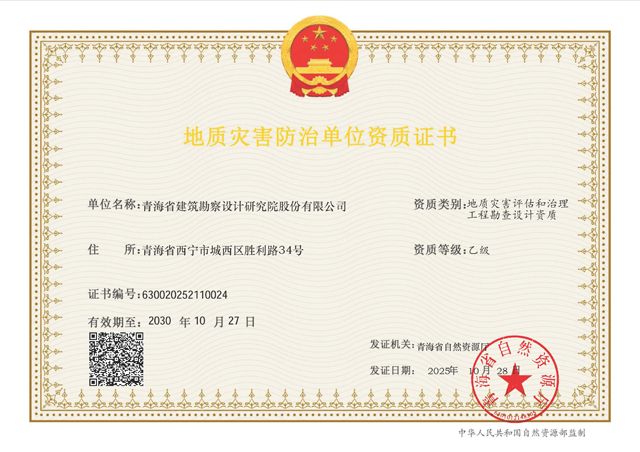 近日,公司獲得由青海省自然資源廳頒發(fā)的“地質(zhì)災(zāi)害評估和治理工程勘查設(shè)計資質(zhì)(乙級)”,標(biāo)志著公司在地質(zhì)災(zāi)害防治領(lǐng)域的業(yè)務(wù)能力和專業(yè)實力邁上新的臺階。